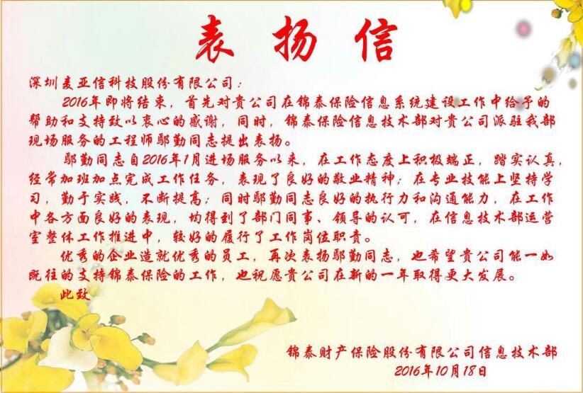近日,深圳麥亞信科技股份有限公司(以下簡稱“麥亞信”)收到一封來自錦泰財產(chǎn)保險股份有限公司(以下簡稱“錦泰財險”)的表揚信,信中對麥亞信技術(shù)人員鄢勤先生提出了高度的表揚。鄢勤先生在錦泰財險信息系統(tǒng)建設(shè)項目的實施過程中,表現(xiàn)出專業(yè)的技術(shù)能力和優(yōu)異的執(zhí)行力,得到了客戶的一致好評。